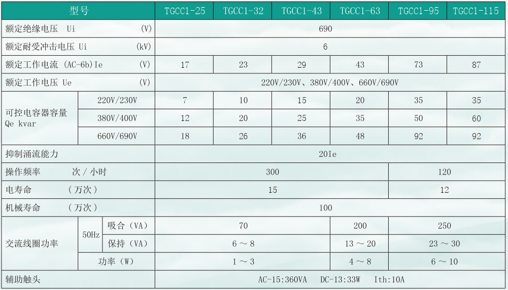 TGCC1 系列切換電容器接觸器 ( 以下簡(jiǎn)稱接觸器 ), 主要用于交流 50Hz( 或 60Hz)、額定工作電壓至 690V, 在 AC-6b 使用類別下可控制電容器容量至 50kvar 的電力系統(tǒng)中 , 接通和分?jǐn)嗖⒙?lián)電容器,以作為改善功率因數(shù)之用。