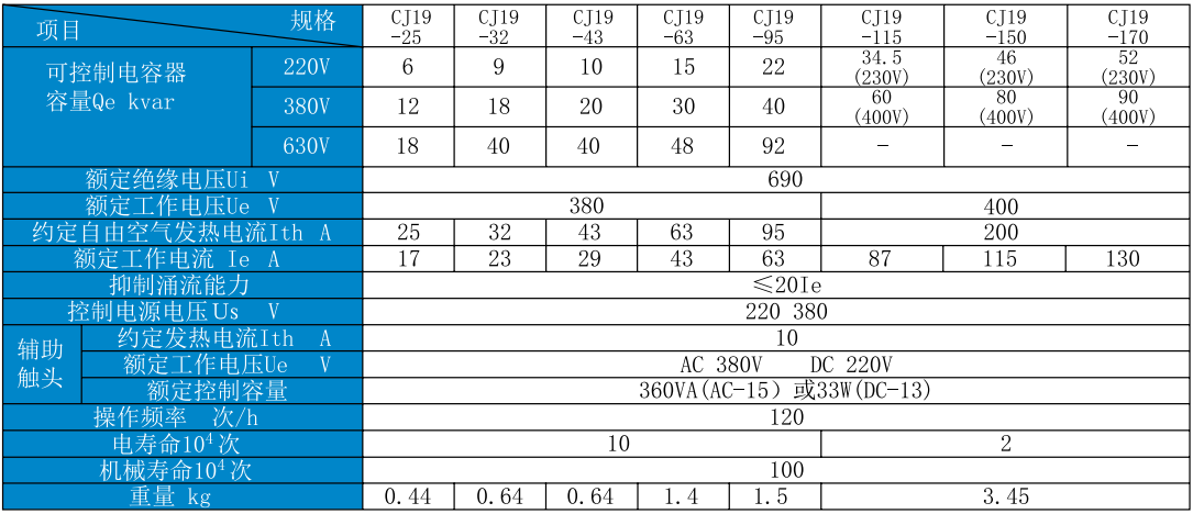 CJ19系列切換電容器接觸器(以下簡稱接觸器)主要用于50Hz(或60Hz)、額定工作電壓至400V的電力系統(tǒng)中,作為功率因數(shù)補償裝置中可控電容器至90Kvar的自愈式低壓并聯(lián)電容器的投入和切除之用。接觸器帶有抑制涌流裝置,能有效的減小合閘涌流對電容器的沖擊和抑制開斷時的過電壓。