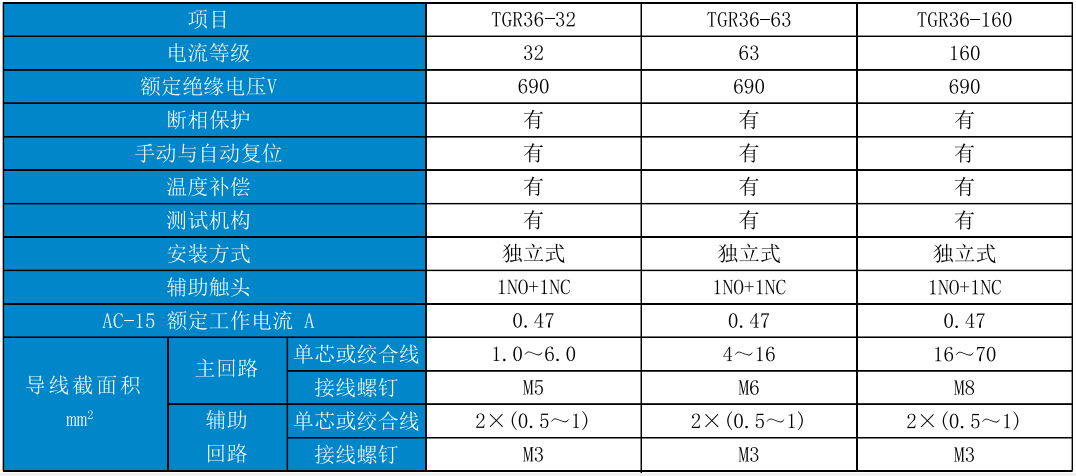 TGR36系列熱過載繼電器(以下簡稱繼電器),適用于交流50Hz(或60Hz)、工作電壓至690V及以下、電流至160A的長期工作或間斷長期工作的交流電動機的過載保護和斷相保護之用。該熱繼電器只有獨立安裝方式,可與CJT1系列接觸器組成TGS51系列電磁起動器。符合標準:GB/T 14048.4、GB/T 14048.5、IEC 60947-5-1