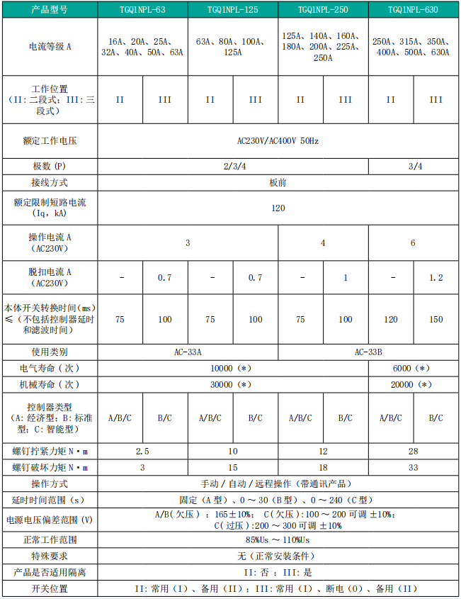 TGQ1NPL 系列自動轉換開關適用于交流 50Hz,額定工作電壓 AC230V/AC400V, 額定電流至630A 的單相二線 / 三相四線雙路供電電網中,用于從一路電源斷開負載電路并連接至另一路電源上。具有自行動作和可選的人工操作特性的轉換開關電器。當常用電源被檢測到出現異常時,ATSE 自動將負載從常用電源轉換至備用電源如果常用電源恢復正常時,在自投自復模式下,則自動將負載返回至常用電源。